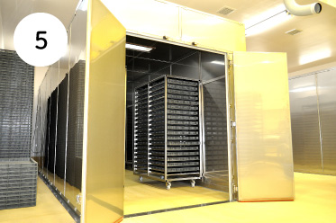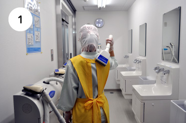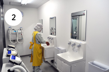 着衣、着帽し、密閉ルームにて再度、毛髪、ホコリを除去する。