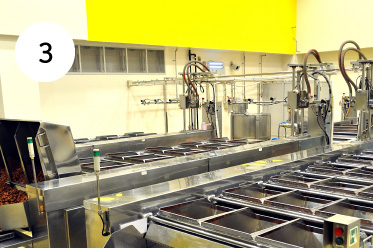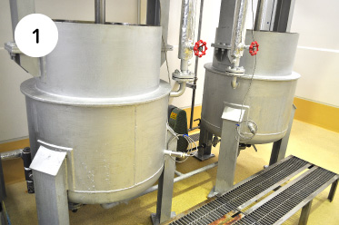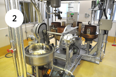 ポンプに送られた液体を四つ鍋にて、煮詰めべっこう飴を液体にする。